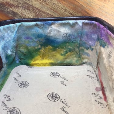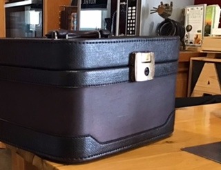 Externally = the makeup bag was an 1970s burgundy that had seen slightly better days almost pink I really wanted a raw umber body something that suggested some age but the shoe Polish which I chose to colour it with only enhanced the burgundy hue so then I sharpie markered the external and highlighted in black the leatherette sections still not happy then black polished the whole case to a point which now I'm happy with it as a jumping off point for future work